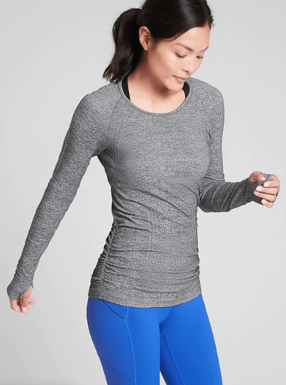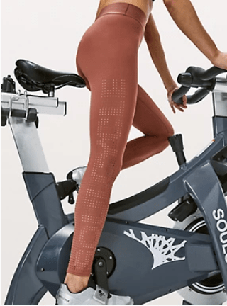 Sleek tights are the way to go for this type of workout. The last thing you want to choose is something loose that may get caught in your cycling shoes or in the bike. Choose tights that are sweat wicking with a compression design like these ones from Athleta or Lululemon below. Pair with a high neck sports bra and a fitted lightweight long sleeve top with thumbholes that will stay in place when you’re spinning. Of course we are all about style so go with pops of color like this beautiful blue or choose a fun print to stand out from the crowd.